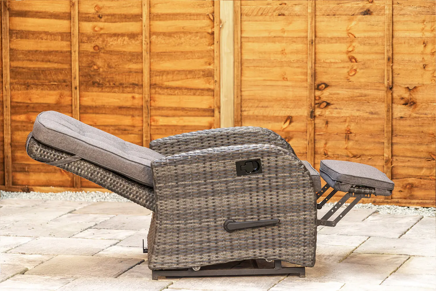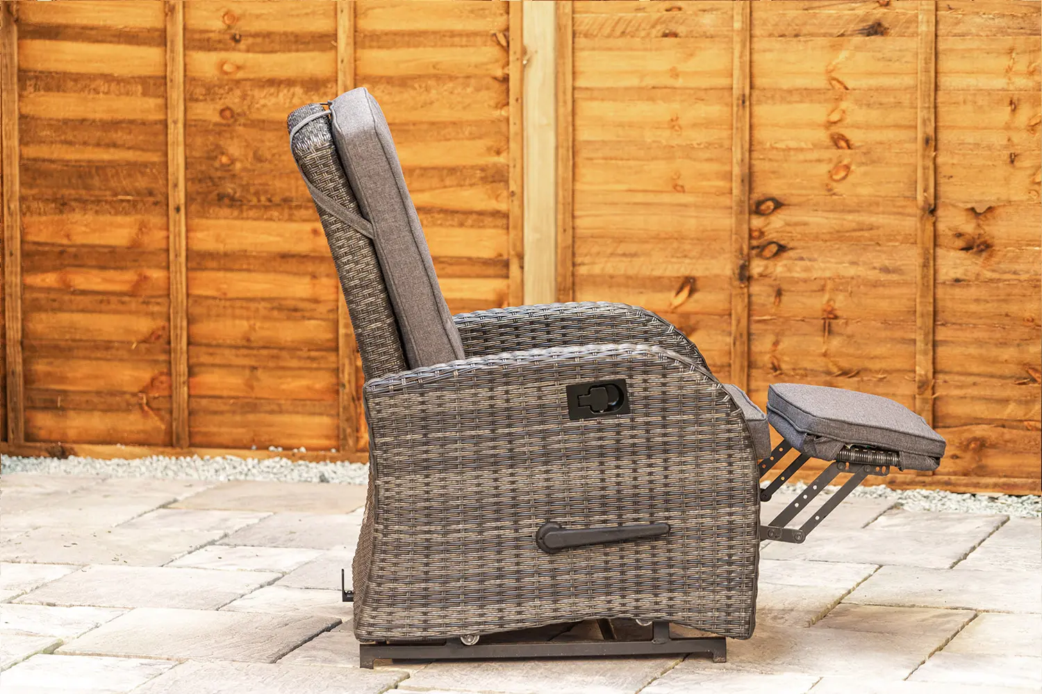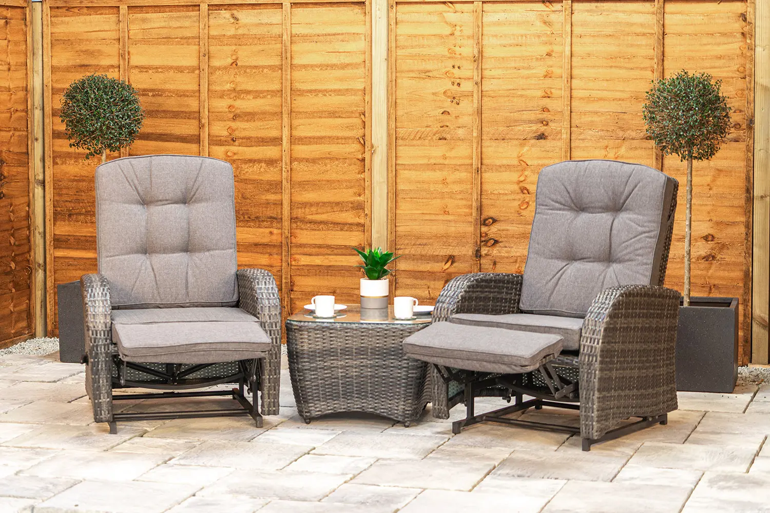 This set comes with two rattan armchairs with built in footrests that both rock and recline.