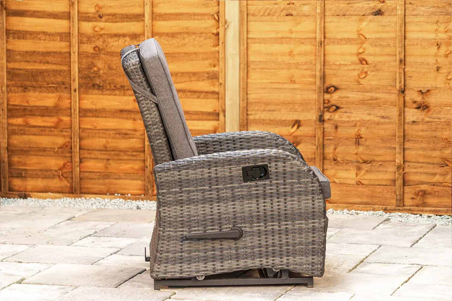 - The recline is controlled using the black lever on the right-hand arm of the chair.